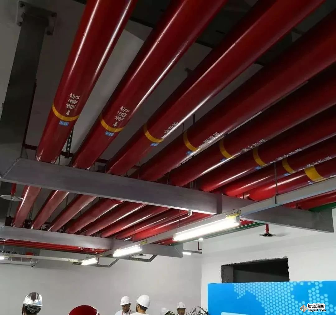 消防噴淋管道間距一致,標(biāo)識清楚、成排成線。