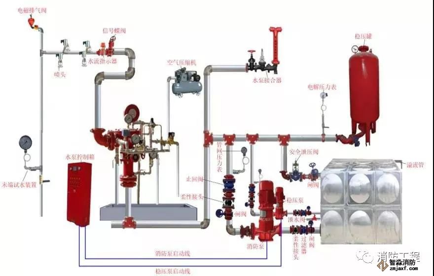 預(yù)作用系統(tǒng)在準(zhǔn)工作狀態(tài)時(shí)配水管道內(nèi)不充水,由火災(zāi)自動(dòng)報(bào)警器自動(dòng)開(kāi)啟預(yù)作用閥后,轉(zhuǎn)換為濕式系統(tǒng),預(yù)作用系統(tǒng)由閉式噴頭、預(yù)作用閥組、充氣設(shè)備(不是必須有)、水流報(bào)警裝置、供水設(shè)施及供水配水管道等組成。