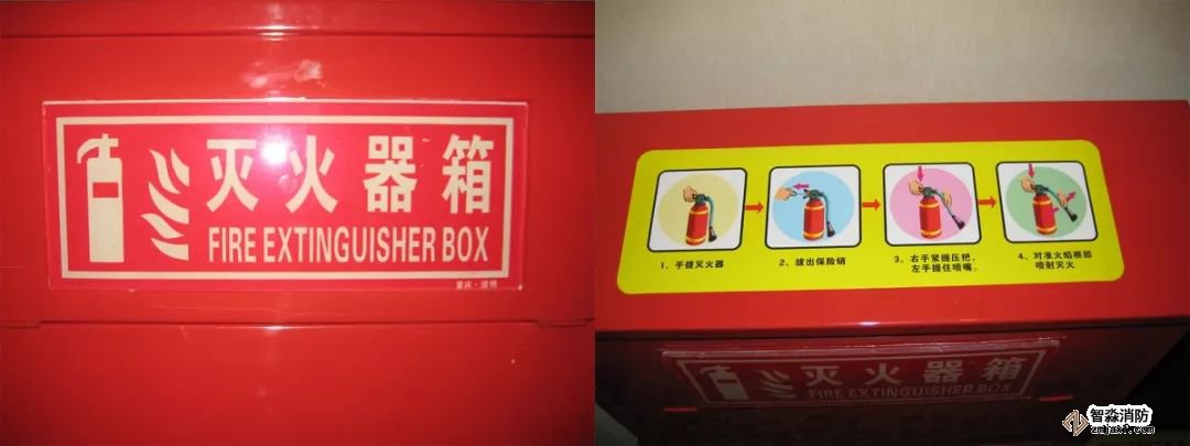 設置要求:在滅火器箱體正面中上部應設置自發光式“滅火器箱”標牌,在箱體上方張貼操作方法圖例,圖例大小420×140mm。