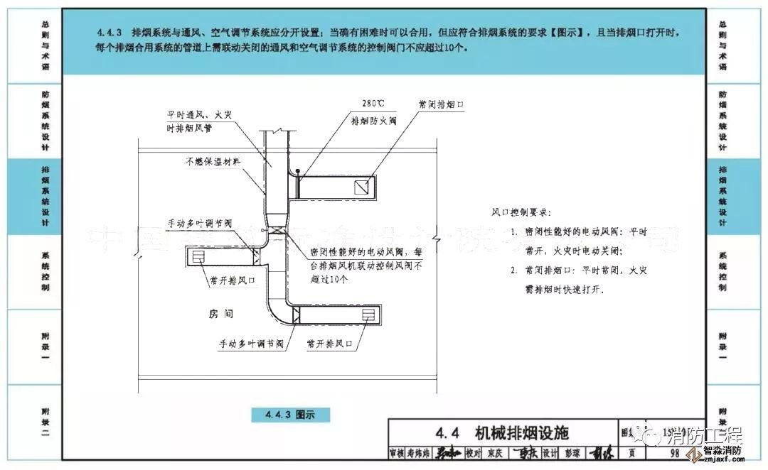 4、第98頁的“4.4.3圖示”中排煙支管上增加了“280℃排煙防火閥”,刪除了“風口控制要求”中“常閉排煙口”280℃自動關閉的字樣。