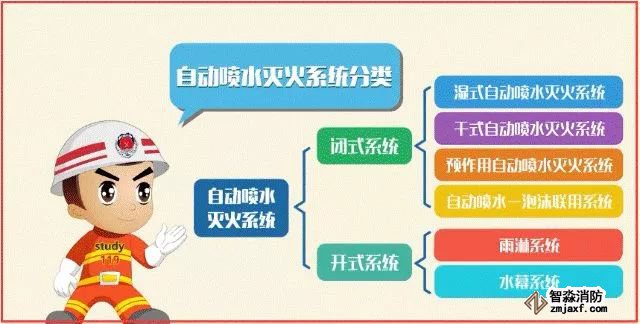自動(dòng)噴水滅火系統(tǒng)根據(jù)所使用噴頭的型式,可分為閉式自動(dòng)噴水滅火系統(tǒng)和開(kāi)式自動(dòng)噴水滅火系統(tǒng)兩大類(lèi)。
