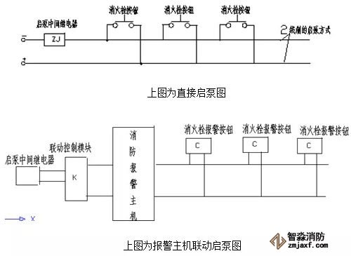 消火栓按鈕啟動消防泵組分為直接啟動消防泵和間接啟動消防泵,原先許多工程因規(guī)范要求不明確,部分采用消火栓按鈕間接啟動消防泵的控制方式;消火栓啟泵按鈕從接線方式分兩種,為消火栓按鈕并聯(lián)接線啟動消防泵和按鈕串聯(lián)接線啟東消防泵。
