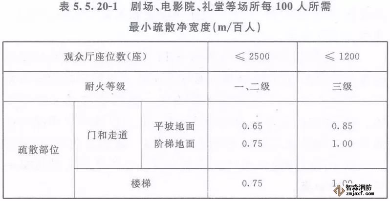 2、劇場、電影院、禮堂等場所供觀眾疏散的所有內(nèi)門、外門、樓梯和走道的各自總凈寬度,應(yīng)根據(jù)疏散人數(shù)按每100人的最小疏散凈寬度不小于表5.5.20-1的規(guī)定計算確定;