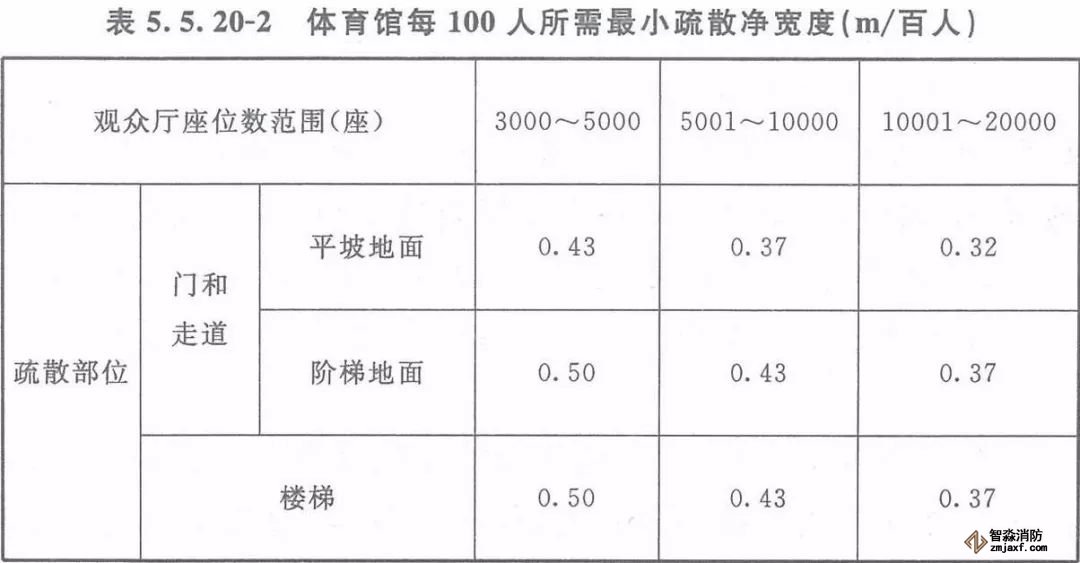 注:本表中對應(yīng)較大座位數(shù)范圍按規(guī)定計算的疏散總凈寬度,不應(yīng)小于對應(yīng)相鄰較小座位數(shù)范圍按其最多座位數(shù)計算的疏散總凈寬度。對于觀眾廳座位數(shù)少于3000個的體育館,計算供觀眾疏散的所有內(nèi)門、外門、樓梯和走道的各自總凈寬度時,每100人的最小疏散凈寬度不應(yīng)小于表5.5.20-1的規(guī)定。