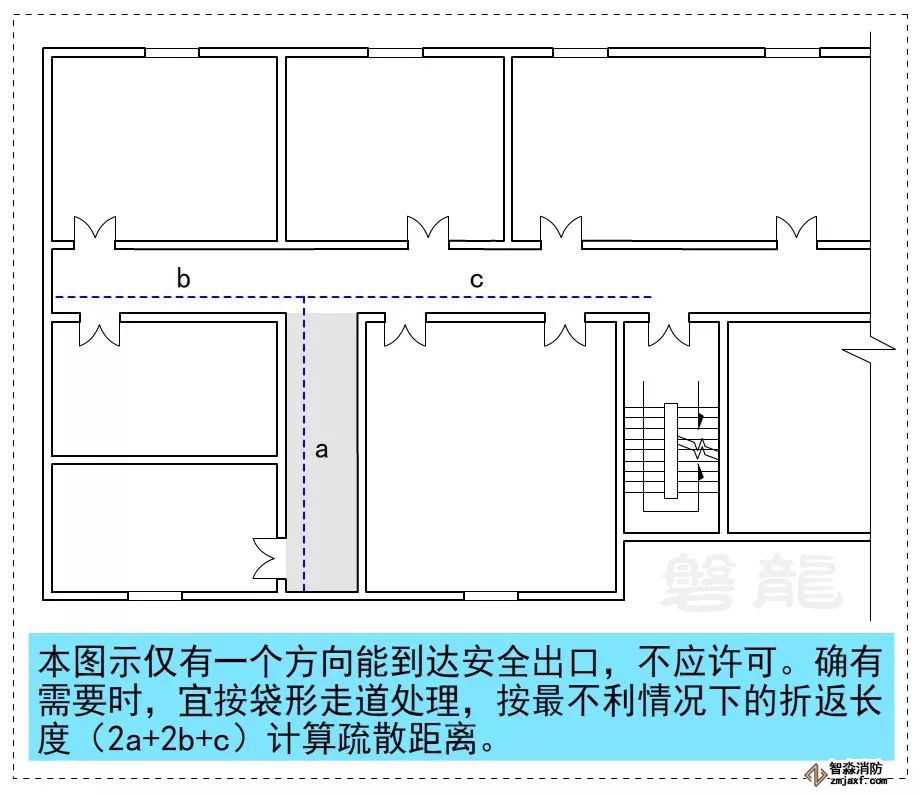 注:本圖示僅有一個(gè)方向能到達(dá)安全出口,不應(yīng)許可。確有需要時(shí),宜按袋形走道處理,按最不利情況下的折返長(zhǎng)度(2a+2b+c)計(jì)算疏散距離。比如,一二耐火等級(jí)的高層教學(xué)建筑:(2a+2b+c)≤15m。
