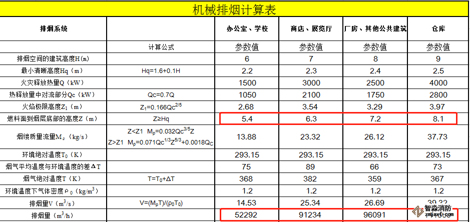 通過反算可知,表4.6.3中的排煙量數據,應該是按儲煙倉高度為10%房間凈高時的結果(以下為有噴淋情況的反算推算表),儲煙倉高度為房間凈高的10%,是規范要求的機械排煙最小儲煙倉厚度,也是燃料面到煙層底部高度(Z)的最大高度,由下表公式可知,相同條件下,煙層底部高度(Z)最大值時對應的排煙量即最大排煙量,也就是說,表4.6.3所列的排煙量為最大排煙量,任何其他計算條件下的排煙量都不可能大于這個排煙量,再規定計算值不應小于表4.6.3中的數值無意義