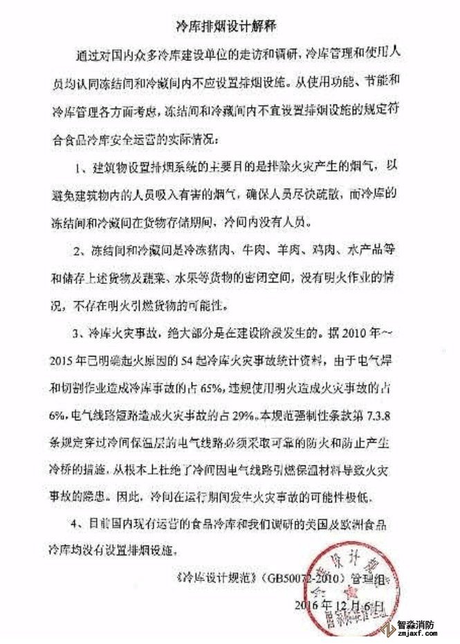 《冷庫設計規范》管理組復函:冷庫排煙設計解釋!