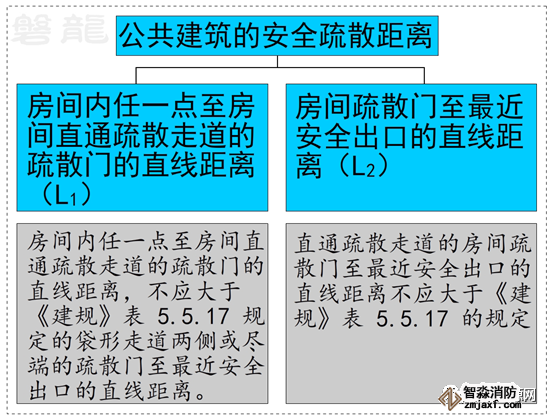 通常情況下,公共建筑的安全疏散距離,包括房間內任一點至房間直通疏散走道的疏散門的直線距離(L1)和房間疏散門至最近安全出口的直線距離(L2),其中L1對應《建規》5.5.17第3款規定,L2對應《建規》5.5.17表5.5.17的規定(圖示1、圖示2)