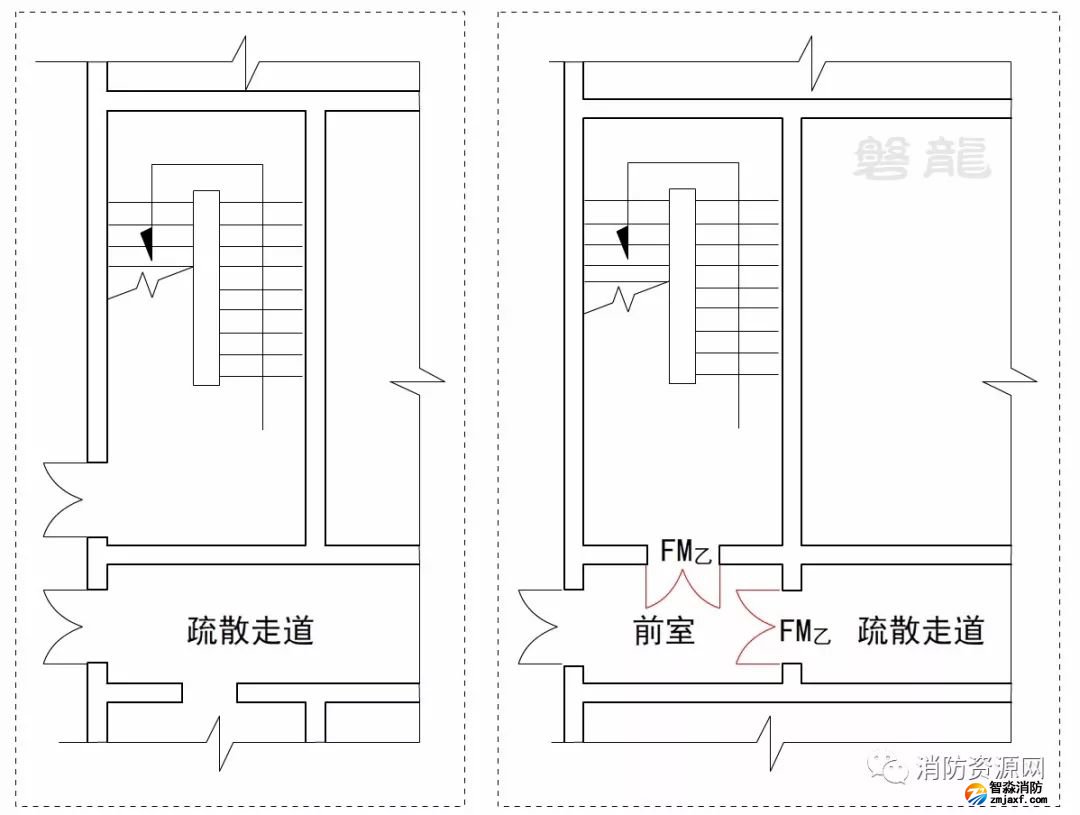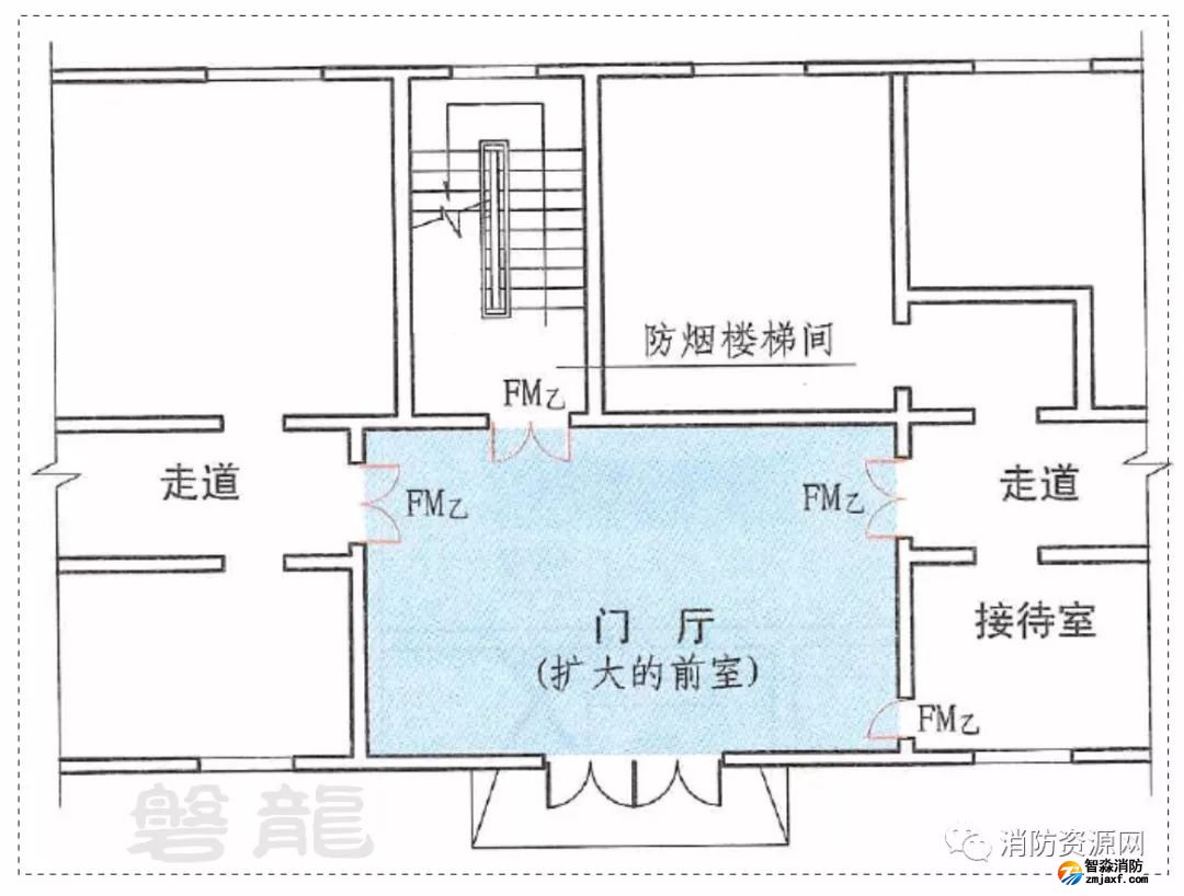 樓梯間的首層可將走道和門廳等包括在樓梯間前室內形成擴大的前室,但應采用乙級防火門等與其他走道和房間分隔。