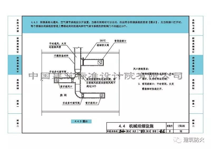 4、第98頁的“4.4.3圖示”中排煙支管上增加了“280℃排煙防火閥”,刪除了“風口控制要求”中“常閉排煙口”280℃自動關閉的字樣。