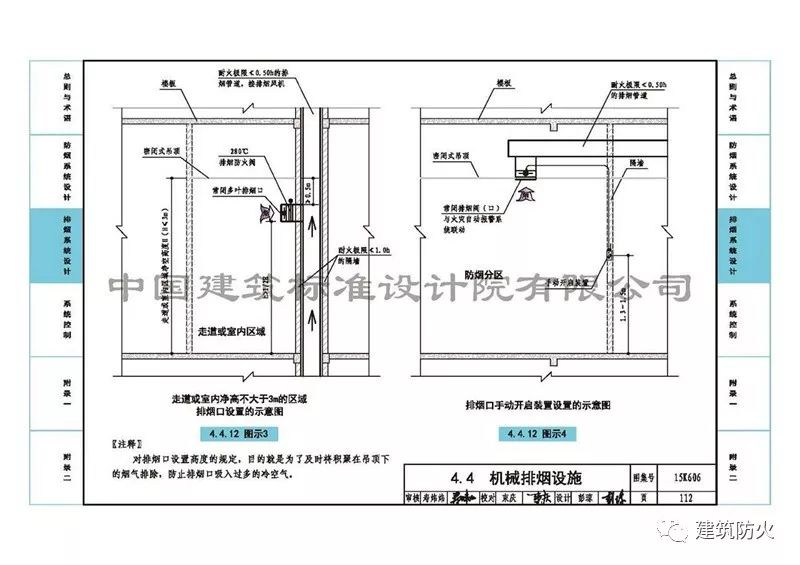 5、第112頁的“4.4.12圖示3”中側墻上安裝常閉多葉排煙口前,排煙支管上增加了“280℃排煙防火閥”。