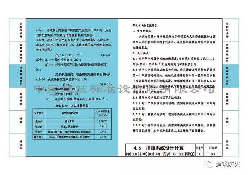 8、第143頁“第4.6.12條[算例1]”:一是字體小了;二是結合《自動噴水滅火系統設計規范》GB50084-2017,將前廳排煙計算從“有噴淋”改為“無噴淋”。