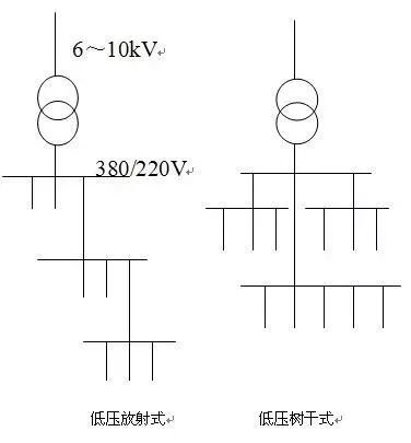 低壓配電系統(tǒng)的接線方式有三種,分別是放射式、樹干式和混合式。