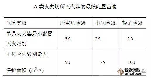 新規(guī)范規(guī)定的A類火災(zāi)場(chǎng)所滅火器的最低配置基準(zhǔn)規(guī)定:?jiǎn)尉邷缁鹌髯钚∨渲脺缁鸺?jí)別為: 嚴(yán)重危險(xiǎn)級(jí)為3A;中危險(xiǎn)級(jí)為2A;輕危險(xiǎn)級(jí)為1A;