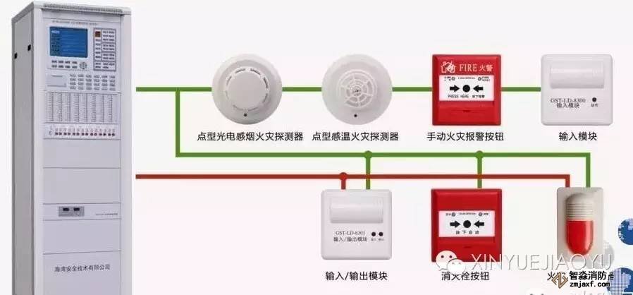 火災自動報警系統包括:火災報警探測器、手動報警按鈕、警報裝置、火災報警控制器、CTR圖形顯示器、火災顯示盤、消防聯動控制設備等。