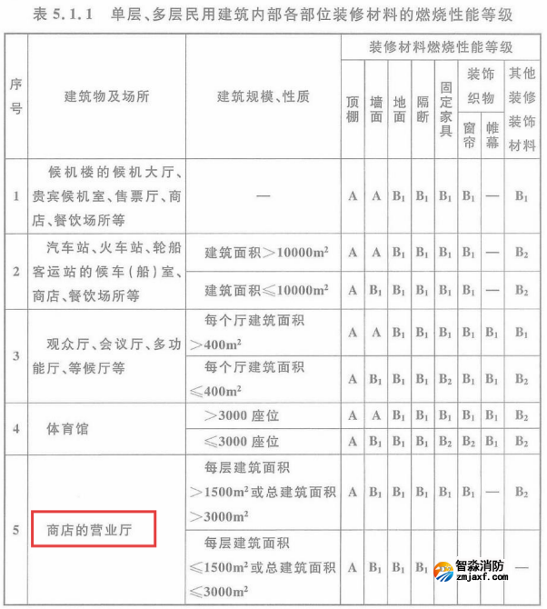 附《建筑內部裝修設計防火規范》GB 50222-2017有關商店建筑裝修材料燃燒性能標準要求: