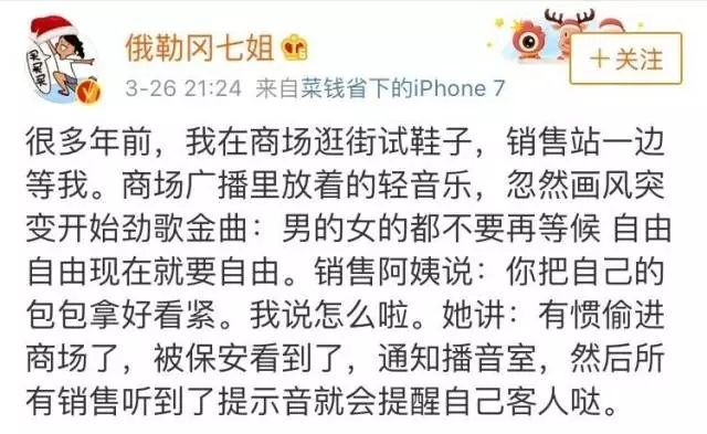 帖子說的是,微博網友發帖稱,逛商場時,如果商場的背景音樂畫風突變,這有可能是商場發現有小偷“來訪”的警告!