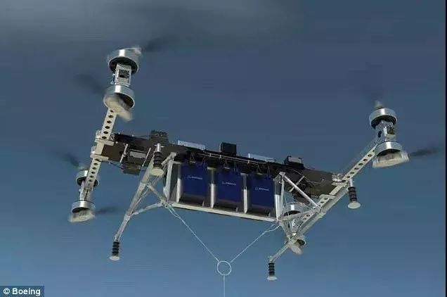 這架無人機可以承載兩頭小象的重量。這艘飛機重達339公斤(747磅),但還能攜帶226公斤(500磅)的貨物。波音公司表示,它可能會利用無人機在未來轉移重型貨物。這個身形矯健的無人機長4.6米(15英尺),寬5.5米(18英尺),高1.2米(4英尺)。從圖中可以看出,它有8個跟直升機一樣的旋翼,可以垂直起降。它是由電力推進系統驅動的。需要運輸的貨物,可以用電纜連接到無人機上。