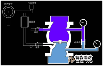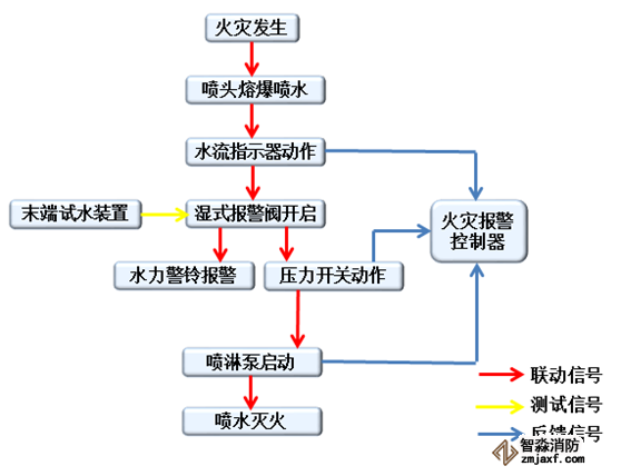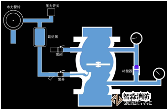 當保護區(qū)域內(nèi)發(fā)生火災(zāi),環(huán)境溫度不斷上升,當環(huán)境溫度達到閉式噴頭動作溫度時,噴頭動作,灑水滅火。使管網(wǎng)一側(cè)(系統(tǒng)側(cè))水壓下降,濕式報警閥閥瓣因上下壓差而開啟,向系統(tǒng)供水滅火。水流指示器因水流作用而動作,火災(zāi)報警控制器收到水流指示器的反饋信號
