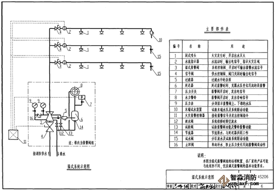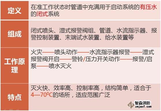 濕式系統(tǒng)由閉式灑水噴頭、水流指示器、濕式報警閥組以及管道和供水設(shè)施等組成,準工作狀態(tài)時管道內(nèi)充滿用于啟動系統(tǒng)的有壓水的閉式系統(tǒng)。