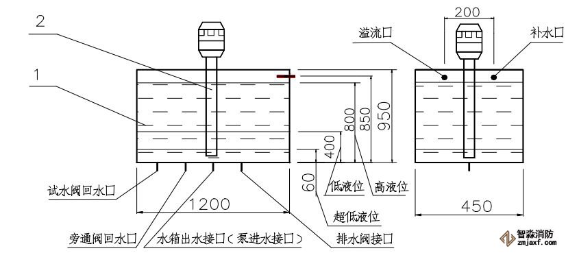 滿液位溢水閥安裝于儲(chǔ)水箱一側(cè),和儲(chǔ)水箱補(bǔ)水組件高度基本處于同一液位。