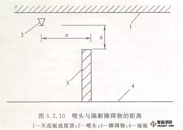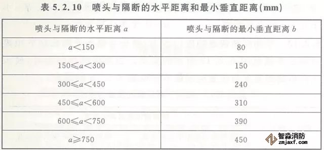 5.2.10 當(dāng)噴頭安裝在不到頂?shù)母魯喔浇鼤r(shí),噴頭與隔斷的水平距離和最小垂直距離應(yīng)符合表5.2.10的規(guī)定(見(jiàn)圖5.2.10)。