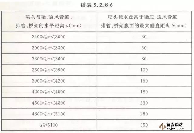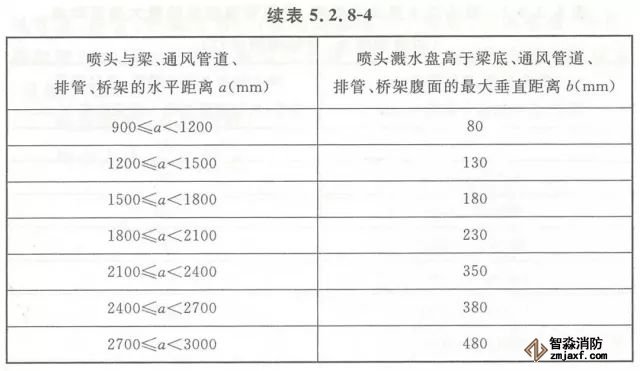 5.2.8 當(dāng)噴頭濺水盤(pán)高于附近梁底或高于寬度小于1.2m的通風(fēng)管道、排管、橋架腹面時(shí),噴頭濺水盤(pán)高于梁底、通風(fēng)管道、排管、橋架腹面的最大垂直距離應(yīng)符合表5.2.8-1~表5.2.8-9的規(guī)定(見(jiàn)圖5.2.8)。