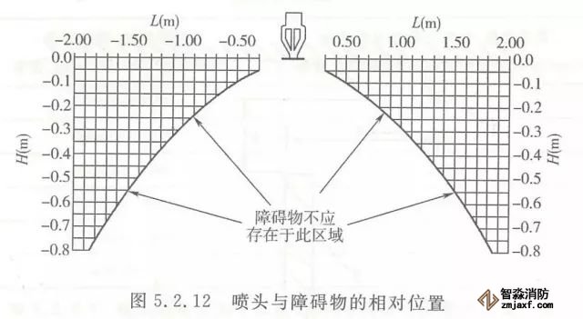5.2.12 頂板處的障礙物與任何噴頭的相對(duì)位置,應(yīng)使噴頭到障礙物底部的垂直距離(H)以及到障礙物邊緣的水平距離(L)滿(mǎn)足圖5.2.12所示的要求。當(dāng)無(wú)法滿(mǎn)足要求時(shí),應(yīng)滿(mǎn)足下列要求之一。