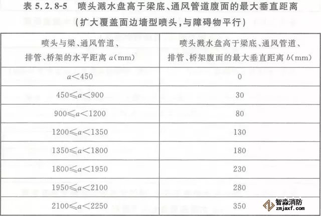 5.2.8 當(dāng)噴頭濺水盤高于附近梁底或高于寬度小于1.2m的通風(fēng)管道、排管、橋架腹面時(shí),噴頭濺水盤高于梁底、通風(fēng)管道、排管、橋架腹面的最大垂直距離應(yīng)符合表5.2.8-1~表5.2.8-9的規(guī)定(見圖5.2.8)。