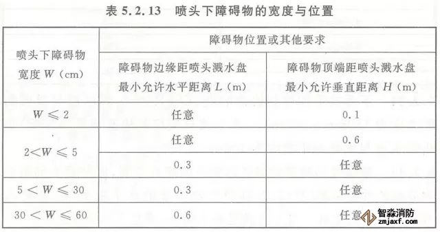 5.2.13 早期抑制快速響應(yīng)(ESFR)噴頭與噴頭下障礙物的距離應(yīng)滿足本規(guī)范圖5.2.12所示的要求。當(dāng)無法滿足要求時(shí),噴頭下障礙物的寬度與位置應(yīng)滿足本規(guī)范表5.2.13的規(guī)定。