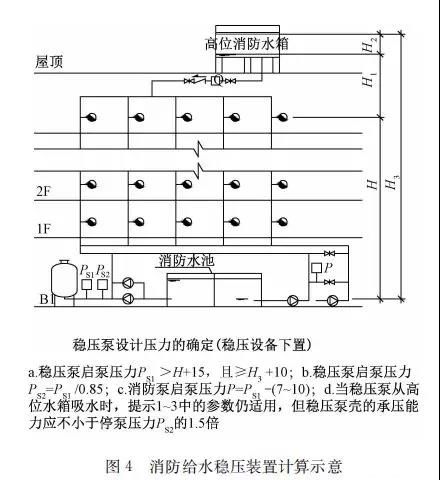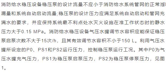 臨時高壓消防給水系統(tǒng)一般均應(yīng)設(shè)置高位消防水箱(除符合規(guī)范規(guī)定可不設(shè)的情形外),且對其設(shè)置高度有一定要求。日本規(guī)范規(guī)定自動噴水滅火系統(tǒng)屋頂消防水箱最不利的最低供水壓力為0.15 MPa,美國、英國規(guī)范則要求0.10 MPa。我國1987年版和2006年版“建規(guī)”對比均沒有規(guī)定,只在條文中要求重力自流的消防水箱應(yīng)設(shè)置在建筑的最高部位。1982年版《高層民用建筑設(shè)計(jì)規(guī)范》(以下簡稱“高規(guī)”)首次提出屋頂消防水箱應(yīng)滿足最不利消火栓的靜水壓力,但沒有提出設(shè)計(jì)參數(shù),1995年版“高規(guī)”做了具體規(guī)定。國標(biāo)圖集98S205編制目的是為解決臨時高壓消防給水系統(tǒng)高位消防水箱設(shè)置高度滿足不了系統(tǒng)最不利點(diǎn)靜水壓力時應(yīng)設(shè)增壓設(shè)施的要求,其為消防專用的增壓穩(wěn)壓設(shè)備的主要功能只是火災(zāi)初期時、消防主泵啟動前,確保具有足夠消防壓力的30 s儲水量進(jìn)行初期火災(zāi)撲救,直至消防主泵全負(fù)荷啟動運(yùn)行。這里更多的還是強(qiáng)調(diào)增壓的概念,設(shè)備類似于氣壓供水,發(fā)揮主要作用的是氣壓水罐,穩(wěn)壓水泵的作用是在3 min內(nèi),補(bǔ)足氣壓水罐內(nèi)實(shí)際穩(wěn)壓水容積。利用氣壓水罐所設(shè)定的P1、P2、PS1和PS2運(yùn)行壓力來控制穩(wěn)壓泵運(yùn)行工況。P1為根據(jù)計(jì)算求得消火栓系統(tǒng)或自動噴水滅火系統(tǒng)中最不利點(diǎn)所需的消防壓力作為氣壓水罐的充氣壓力。平時管道系統(tǒng)如有滲漏泄壓等情況,控制穩(wěn)壓水泵不斷補(bǔ)水穩(wěn)壓,在PS1、PS2(啟動-停止)反復(fù)運(yùn)行,一旦有火情,管道系統(tǒng)大量缺水,造成PS1下降(PS1→P2),降至P2時,立即啟動消防主泵。