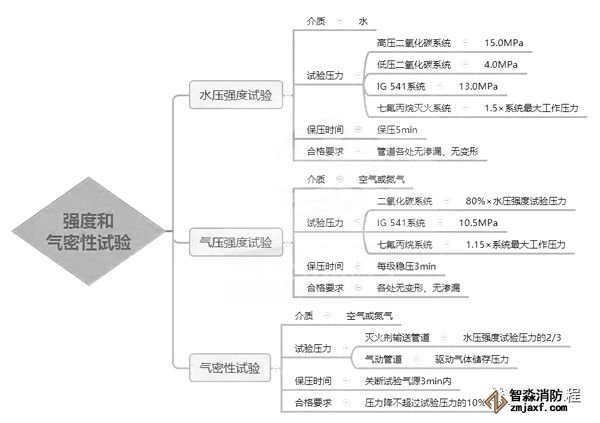 1.滅火劑輸送管道安裝完畢后,應進行強度試驗和氣壓嚴密性試驗,并合格。
