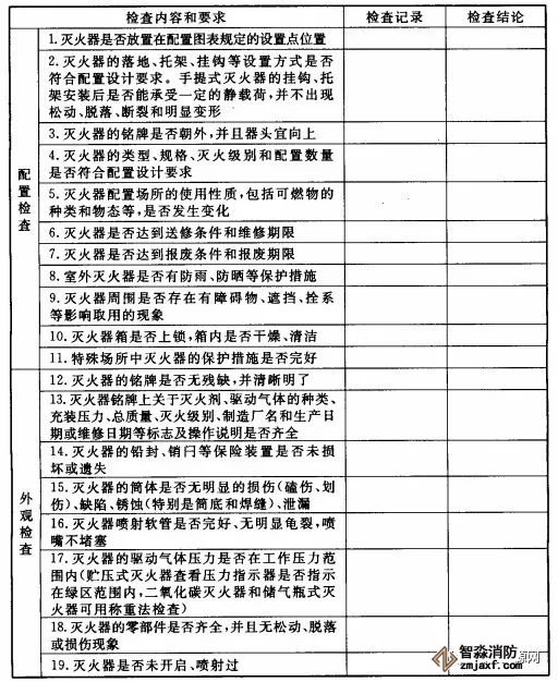 根據(jù)GB50444要求,滅火器的配置、外觀等至少每月檢查一次;對于候車(機、船)室、歌舞娛樂放映游藝等人員密集的公共場所,以及堆場、罐區(qū)、石油化工裝置區(qū)、加油站、鍋爐房、地下室等場所,至少每半月檢查一次,基本檢查內(nèi)容及要求如下: