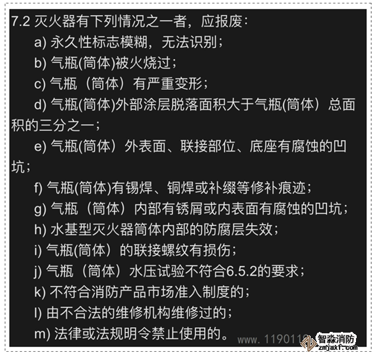 GB50444和GA95均規(guī)定了滅火器需要報廢的情形,在滅火器的日常和定期巡檢中,若發(fā)現(xiàn)以下情況之一的,應(yīng)予以報廢: