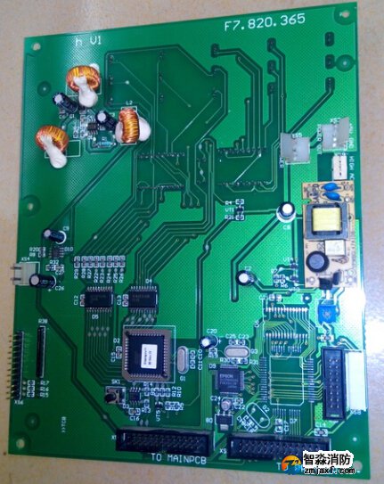 海灣GST500主機(jī)液晶顯示器無(wú)背光,拆下液晶顯示器的發(fā)光管,可以點(diǎn)亮,說(shuō)明發(fā)光部分沒(méi)有問(wèn) 題,問(wèn)題出在開(kāi)關(guān)板上,開(kāi)關(guān)板上有一升壓模塊(圖中標(biāo)出紅色的部分),提供液晶顯示器背光所需的 高壓。